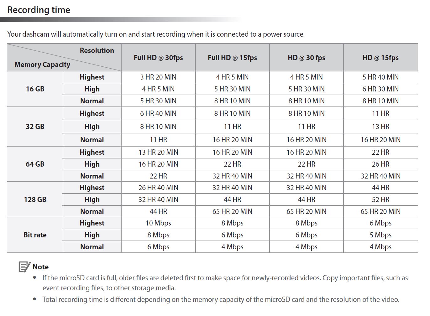| Loop Recording | System overwrites the oldest data to make room for new data once full |