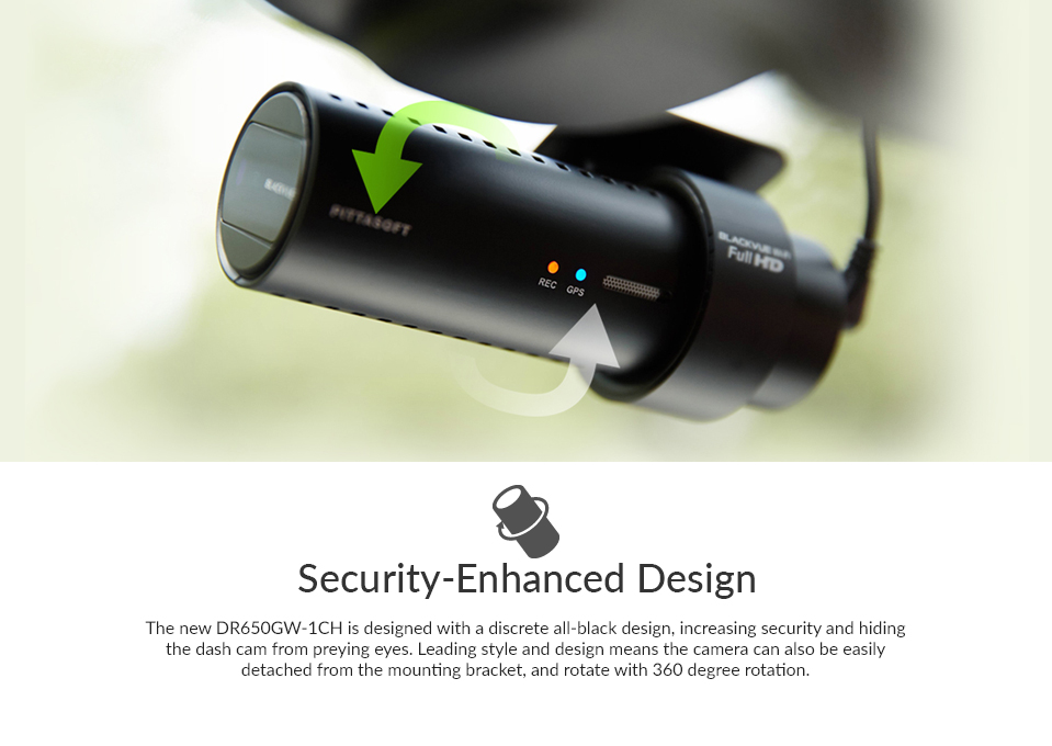 An innovative cylindrical design enables the DR650GW-1CH camera to be rotated 360' degrees to ensure optimum viewing and customization of viewing angles. The cylinder shaped design means the unit will neatly and conveniently sit behind your rear vision mirror.